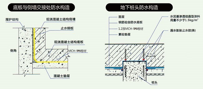 修補(bǔ)破損點(diǎn)時(shí),截取不小于150mmx150mm的MCH-TPO高分子防水鞋材,覆蓋在破損區(qū)域上,用MCH-TPO卷材專用膠或膠帶進(jìn)行修補(bǔ)井密封,與原防水層形成整體,在MCH-TPO卷材鋪設(shè)完成后應(yīng)盡快澆筑結(jié)構(gòu)混凝土。在澆筑混凝土前,應(yīng)采取措施確保己驗(yàn)收合格的MCH-TPO卷材表面干凈、無雜物,達(dá)到卷材與混凝土形成有效粘結(jié)的目的,在澆筑混凝土過程中要小心操作,防止人為破壞MCH-TPO卷材防水層。