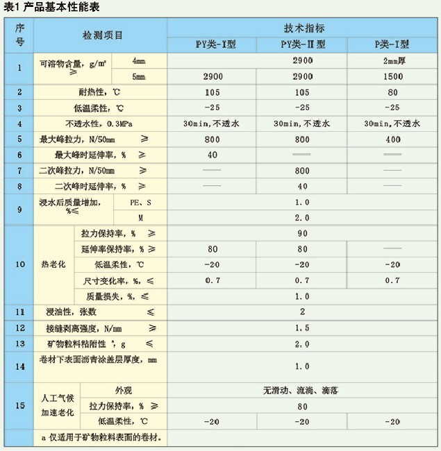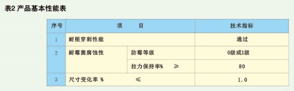 上述產(chǎn)品性能包括基本性能和應(yīng)用性能?;拘阅芊掀髽薌B18242-2008《彈性體改性瀝青防水卷材》要求(見表1)。應(yīng)用性能符合JC/T1075-2008《種植屋面用耐根穿刺防水卷材》要求(見表2)。