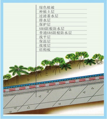 適應(yīng)種植屋面及需要綠化的地下建筑物頂板的耐植物根系穿刺層,確保植物根系不對該層次以下部位的構(gòu)造形成破壞、并有防水功能。